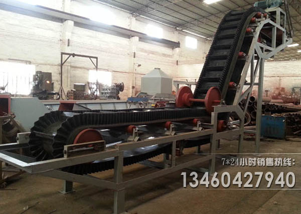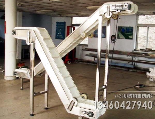 b)擋邊皮帶輸送機(jī)用于斜坡輸送,可以把低處產(chǎn)品提升到一定的高度,用于物料提升,在提升的過程中,可以將散料放在一格一格里面,在傾斜的角度中,不會(huì)滑;