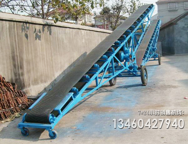 可移動(dòng)式膠帶輸送機(jī)適用于散狀物料或成件物品的短途運(yùn)輸和裝卸工作。采用鋼管結(jié)構(gòu),輕巧美觀,機(jī)動(dòng)性好。轉(zhuǎn)動(dòng)裝置為電動(dòng)滾筒,并配有充氣輪胎和鋼輪兩種行走輪。機(jī)長(zhǎng)10米以上傾角可調(diào)。